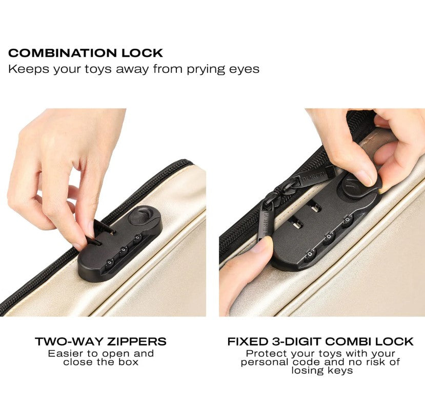 Because your secrets are your own business, the Discreet Box can be locked with an integrated padlock with a customizable code. Rest assured, you won't risk losing the keys. Its large storage capacity 4-5 medium-sized toys allows you to keep all your favorite toys all your favorite toys within easy reach. Its sober and refined black look allows it to pass incognito in your room, your bathroom, or your suitcase. The internal pocket and the elastic bands inside keep your accessories and cleaning products perfectly in place.