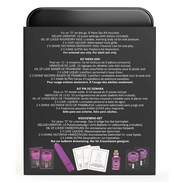 The all new Vibe Weekender Kit is here! Be ready for spontaneous fun with the perfect mix of Kama Sutra luxuries and a battery-powered mini vibe with 10 vibration settings. Perfect portions fit comfortably in a pocket, luggage, bag or purse for a weekend away or anytime the mood strikes.